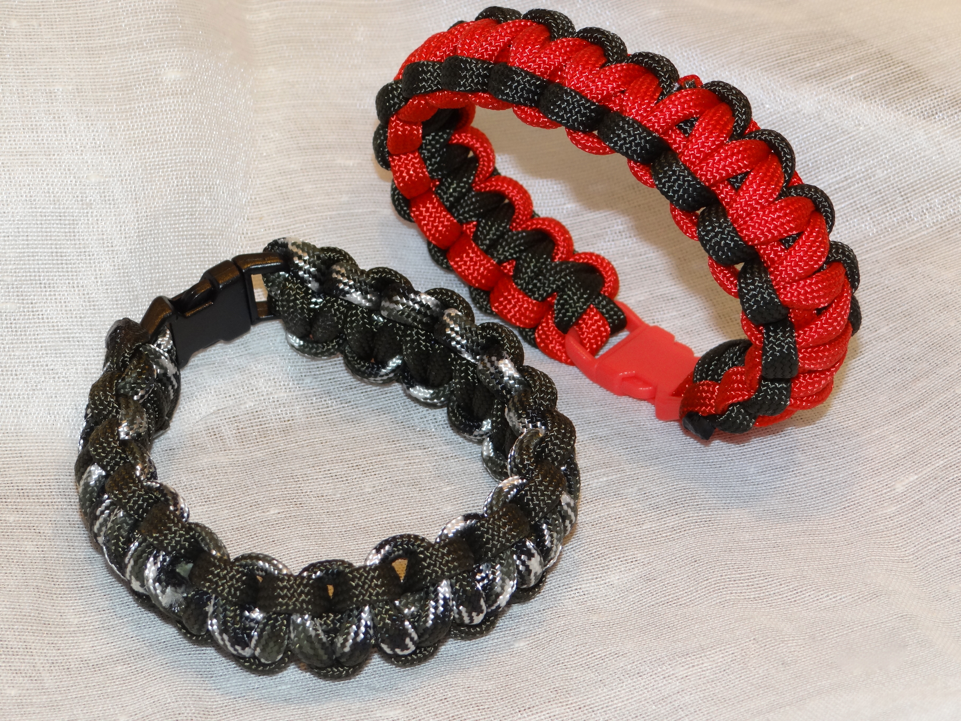 These are parachute cord bracelets. They are great for any age group. The neat thing is that the colors are reversed on the other side. There are two widths and many fun color combinations to choose from. You can make bracelets or necklaces with many different knot patterns and lengths.