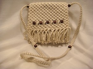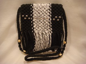 Here is a great “gotta run” purse. It incorporates an eight inch internal flex frame. The cords are attached by using larks head knots onto the frame and tied from there. This purse uses about 54 yards of 4mm cord in three colors.