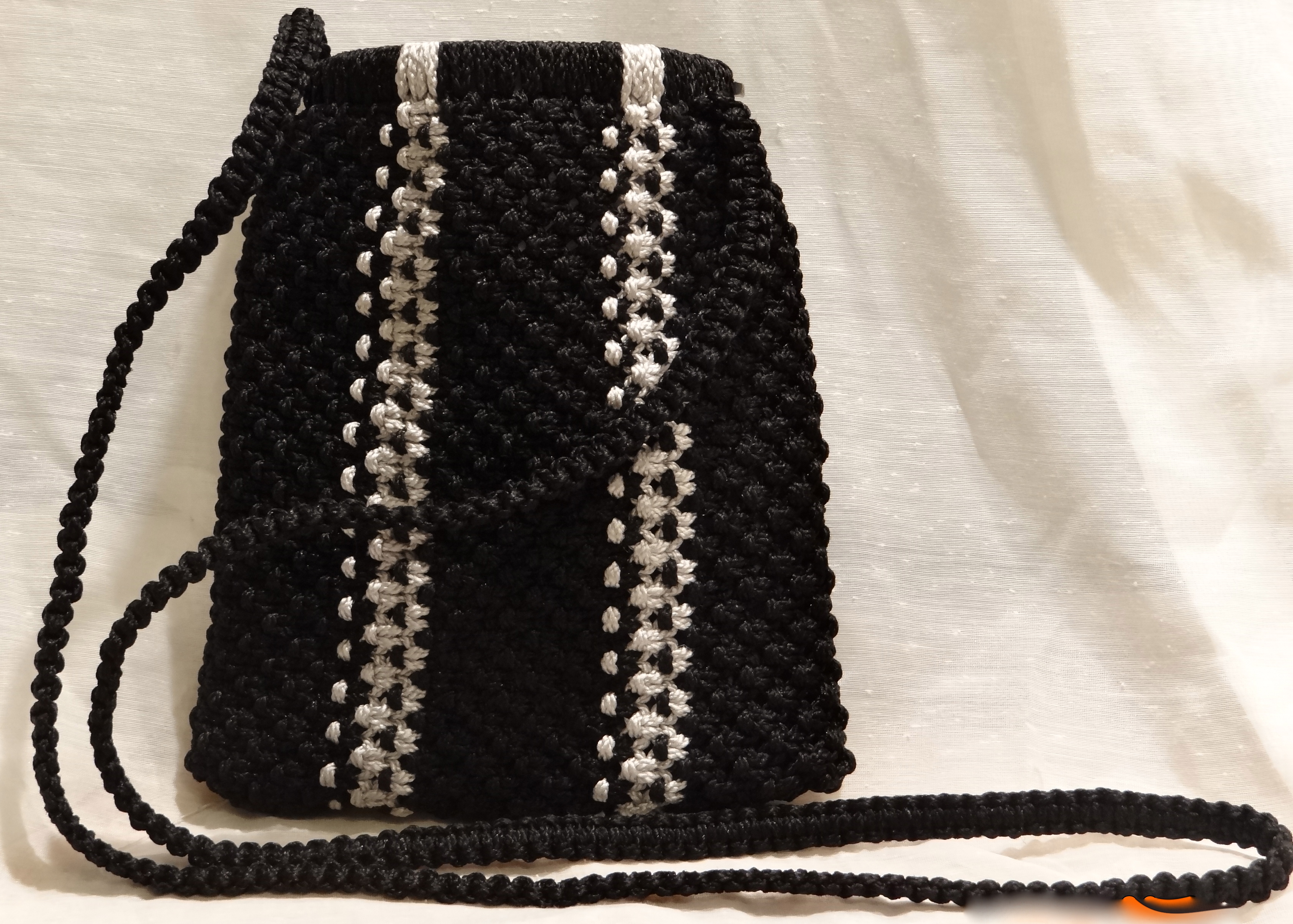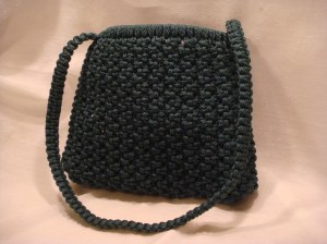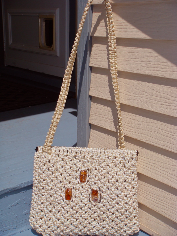Here is the first of many. It is a 12″ Flex Frame Macrame purse.