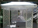 Not only does it look nice, but it is very easy to transport. They are held up with a bungy strap on each side at the top and when you are finished with them, just roll them up and put it into the back of the pickup track. The wood boards will be held together with lag bolts and wing nuts; easy to set up and take down. They will fit along side the rolled walls and the pop up tent.